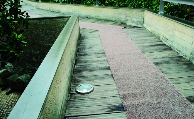 Las tablas superficiales, por donde hay que pisar, se encuentran, unas levantadas y otras hundidas. Por las características el material, que está expuesto a la intemperie, con las humedades propias y las diferencias de tempera, acusa mermas, crecidas y encorvamientos, que dan como resultado diferencias de nivel entre una madera y otra.