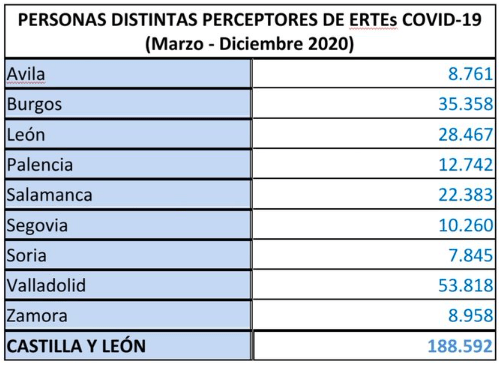 En Castilla y León, desde la declaración de estado de alarma y la promulgación del RD Ley 8/2020, de 17 de marzo, de medidas urgentes extraordinarias para hacer frente al impacto económico y social del Covid-19, hasta el 31 de diciembre de 2020, se han aprobado 41.459 ERTES, incluyendo tanto los de fuerza mayor como los que se fundamentan en causas económicas, técnicas, organizativas y de producción, que afectaron en total, acumulado de marzo a diciembre de 2020, a 188.592 personas, de las que a 31 de diciembre percibieron una prestación por regulación temporal de empleo 47.527.