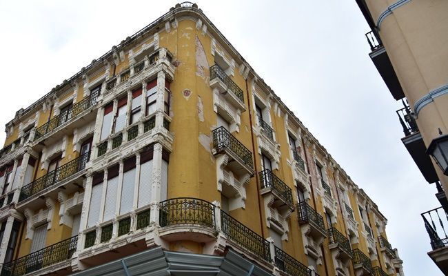 Enfrente, otra inmueble considerado dentro del eclecticismo, construido en 1917, deshabitado, con un perímetro metálico  protector,  que evitaría, en principio, que cascotes de paredes y balcones cayesen directamente sobre transeúntes y vehículos que pasan por la calle Mariano Benlliure, también se encuentra en pésimo estado, resquebrajado, con pérdidas ostensibles de materiales, sin que los propietarios del inmueble hayan hecho nada para suturar tanta herida en la estructura de la hacienda.