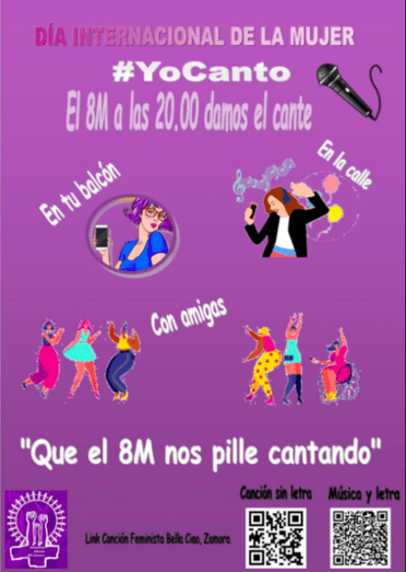 Sin embargo, las feministas de Zamora sí han organizado y piden colaboración "desde los balcones", con el #yocanto, a las 20:00 h. de la tarde, cuando se espera que se cante y escuche por toda Zamora la canción "Bella Ciao", considerada un himno feminista.