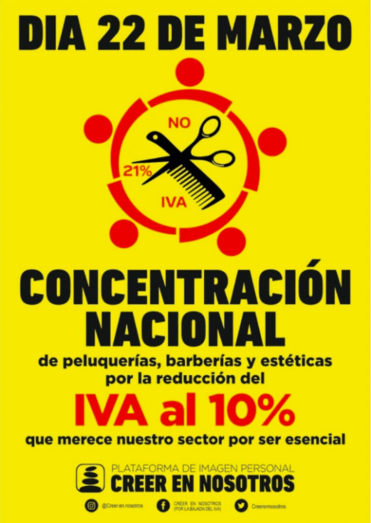 Tras la movilización histórica de las peluquerías y salones de estética que tuvo lugar el pasado 20 de enero en toda España para reclamar la recuperación del IVA reducido al sector de la imagen personal y que tuvo lugar en 77 ciudades, el próximo 22 de marzo, tendrá lugar una nueva movilización de la peluquería y estética a nivel nacional que pretende ser aun más grande que la de enero ya que a día de hoy, hay más de 80 localizaciones confirmadas, y se intentará que se desarrolle en más de 100 ciudades de toda España.