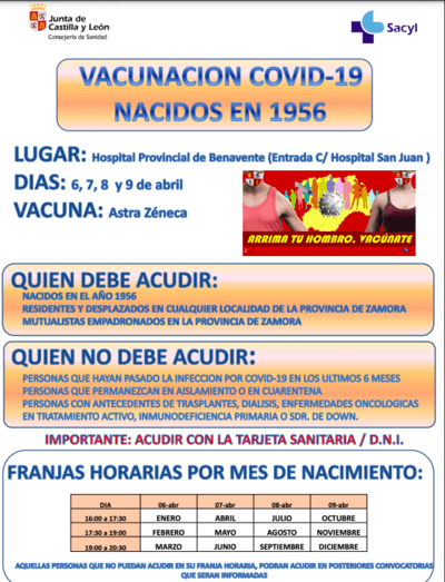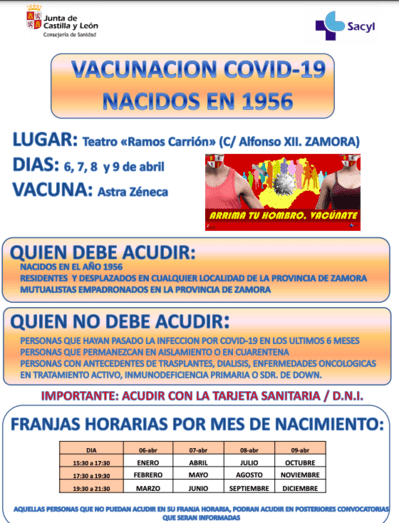Deben acudir los nacidos en el año 1956, residentes en cualquier localidad de la provincia de Zamora y mutualistas empadronados en la provincia. Además, es importante respetar las franjas horarias de vacunación de cada día, según el mes de nacimiento del ciudadano. Aquellas personas que no puedan vacunarse en su tramo horario correspondiente podrán acudir, según se informara, en las próximas campañas que se organizaran.