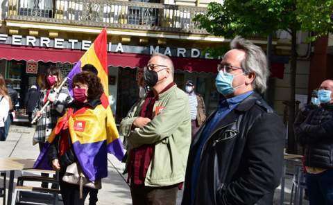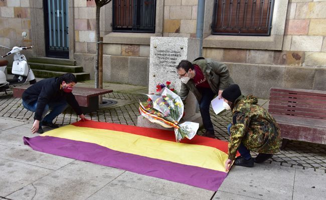 Francisco Guarido, alcalde de Zamora, acompañado de los concejales del equipo de Gobierno del Ayuntamiento, más algunos jóvenes portando banderas del PCE y comunistas, y republicanas, rindieron hoy homenaje a la II República, en el noventa aniversario de su proclamación, en el monumento a los republicanos, sito en el ala este de la Subdelegación del Gobierno.