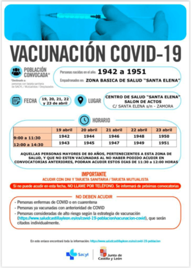 Nuevo llamamiento de la Junta para la vacunación de zamoranos, esta vez, para personas nacidas entre los años 1942 a 1951, es decir, de 70 y 79 años de Zamora capital, que tendrán que acudir a sus centros en los horarios que les indiquen con llamamientos individuales, en principio, menos los usuarios del centro de salud Santa Elena, que son convocados, por años, un día y a unas horas concretas, entre el 19 y el 23 de abril.