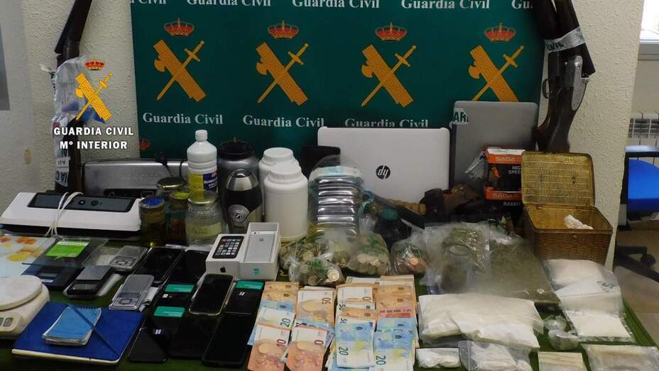 Como resultando de estas intervenciones, se procedió a la incautación, por parte de los agentes, de 2 kilogramos de sulfato de anfetamina (Speed), y otras cantidades importantes de ketamina, hachís y marihuana, así como otra serie de sustancias relacionadas con la fabricación de estos productos, además de básculas, de precisión, elementos de corte y envasado, cuadernos de anotaciones, 8 teléfonos móviles, tres armas de fuego (escopetas) y 5.000 euros en billetes de diverso valor y un vehículo.