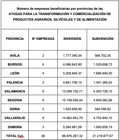 En este sentido, también ha  explicado que la Consejería de Agricultura, Ganadería y Desarrollo Rural acaba de resolver la convocatoria de ayudas para la transformación y comercialización de  productos agrarios, silvícolas y de la alimentación en Castilla y León por un importe de 21,2 millones. En esta convocatoria se han resuelto favorablemente expedientes de inversión correspondientes a 46 empresas, que van a percibir un total de 21.218.877 euros de subvención. La mayoría de estas empresas, un 67%, son pymes. En concreto, se han resuelto positivamente 31 solicitudes de pymes y 15 de grandes empresas. Entre los beneficiarios de estos apoyos se encuentra precisamente Cárnicas Tabladillo, que ha recibido una ayuda de más de 600.000 euros.