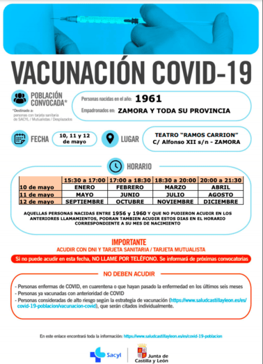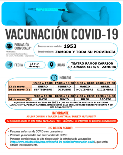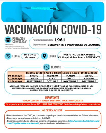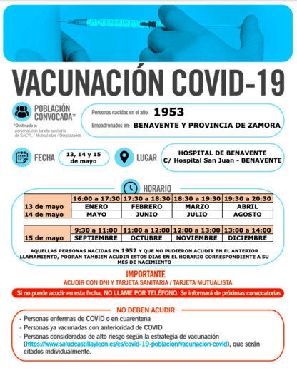 Las personas nacidas en 1953 podrán acudir al Teatro Ramos Carrión o al Hospital de Benavente, los días 13, 14 y 15 de mayo. Los nacidos en 1961 podrán asistir, a los puntos de vacunación anteriormente citados, los días 10, 11 y 12 de mayo. El llamamiento será por cartel informativo y no por llamada individual