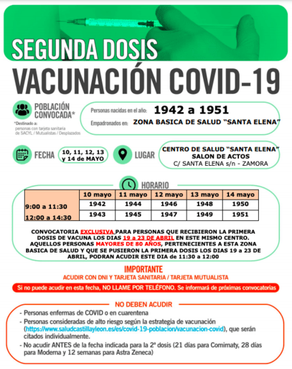 Con respecto a segundas dosis, los días 10, 11, 12, 13 y 14 de mayo se vacunará a personas nacidas entre 1942 y 1951 y empadronadas en la Zona Básica de Salud Santa Elena.