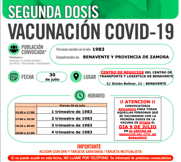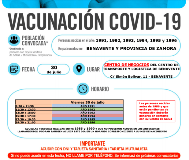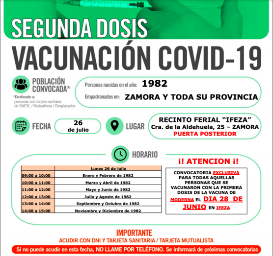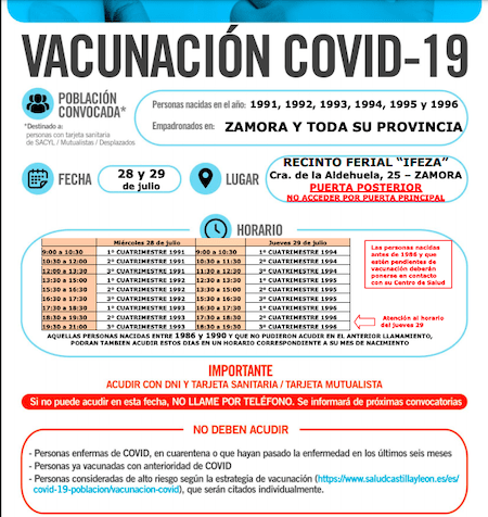 Aquellas personas nacidas entre 1986 y 1990 que no pudieron acudir en el anterior llamamiento, podrán hacerlo estos días en un horario correspondiente a su mes de nacimiento. Además, las personas nacidas antes de 1986 y que están pendientes de vacunación deberán ponerse en contacto con su centro de salud. Asimismo, el día 26 de julio (en el Recinto Ferial IFEZA de Zamora) se llevarán a cabo las inoculaciones de SEGUNDAS DOSIS de los nacidos en 1982 vacunados con Moderna y el 30 de julio (en el Centro de Negocios de Benavente), las inoculaciones de SEGUNDAS DOSIS de Pfizer para los nacidos en los años 1983.