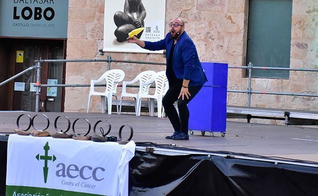 Roberto Vizán fue el divertido, magnífico y amable maestro de ceremonias de la Gala Solidaria contra el Cáncer, que se ha celebrado esta tarde noche en la plaza de la Catedral, con actuaciones del mago Julio Rapado,, los malabares de Pumuki Circo Chisme, la actuación del rockero Mark Feel y como cierre la actuación del grupo Fantasía.