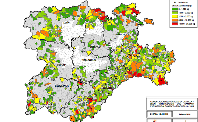 En total en Castilla y León para el periodo 2013-2020, se ha autorizado el uso de 1.902.000 kg de determinados subproductos SANDACH para la alimentación de especies necrófagas de interés comunitario en ZPAEN. Las autorizaciones son anuales y tienen carácter indefinido salvo incumplimiento de las condiciones sanitarias establecidas.