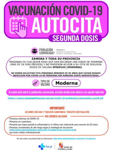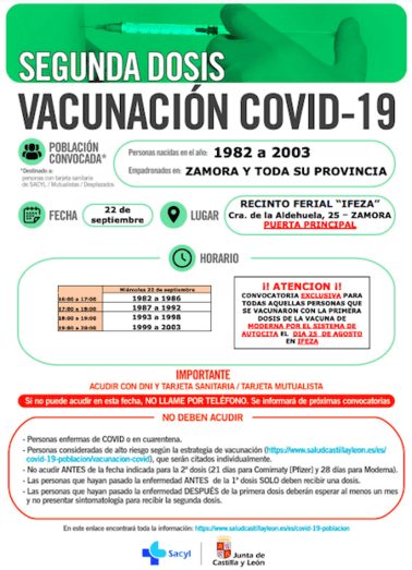 El miércoles 22 de septiembre en el Recinto ferial IFEZA Zamora – Personas de cualquier edad que han recibido una dosis de Moderna (más de 28 días previos) y no pudieron acudir a su cita de segunda dosis de vacuna Moderna.