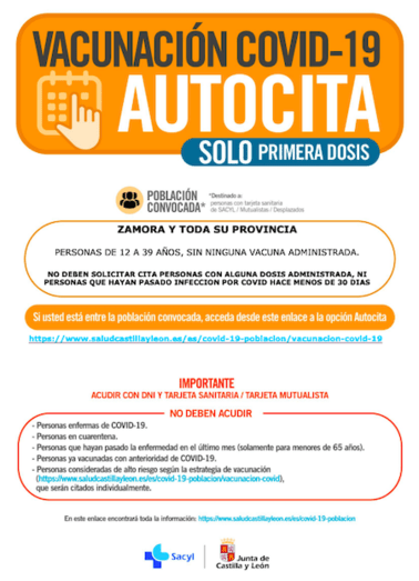 El viernes 24 de septiembre en el Hospital Virgen de la Concha (puerta de Consultas Externas, Avda Requejo) Zamora – Usuarios menores de 40 años, sin vacunar (si han pasado infección por Covid-19 que hayan pasado al menos 30 días).