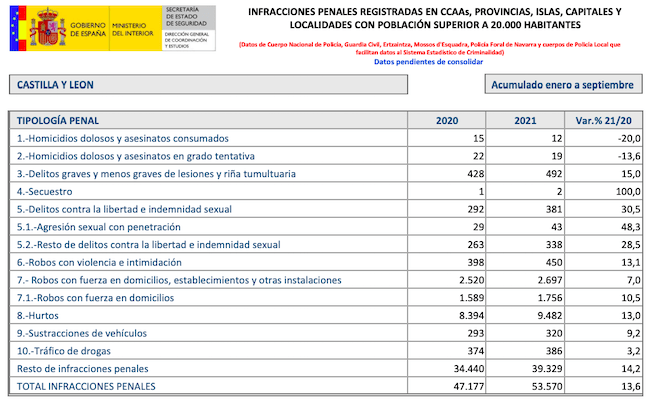 El Balance de Criminalidad correspondiente al tercer trimestre del año 2021, publicado por el Ministerio del Interior, recoge la evolución de la criminalidad en España registrada durante los primeros nueve meses del año por las Fuerzas y Cuerpos de Seguridad del Estado (Policía Nacional y Guardia Civil), los Cuerpos y Fuerzas de Seguridad dependientes de las comunidades autónomas (Ertzaintza, Mossos d'Esquadra y Policía Foral de Navarra), y también por aquellos cuerpos de Policía Local que facilitan datos a las Fuerzas y Cuerpos de Seguridad del Estado.