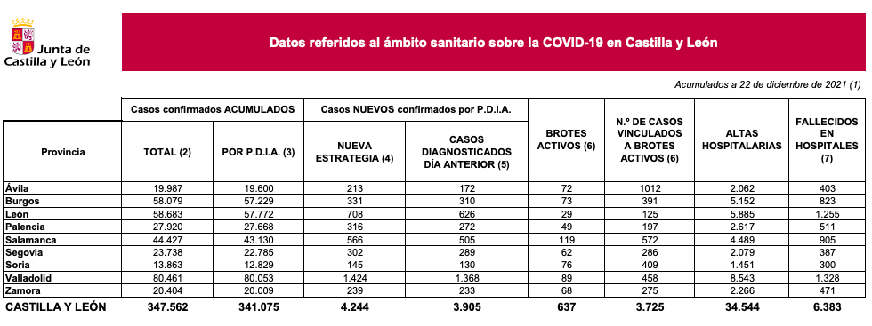 La situación sanitaria, recogida territorialmente, puede consultarse en el archivo adjunto de forma más amplia a través de este enlace al Portal de Transparencia de la Administración castellana y leonesa ( Enlace a la información estadística sanitaria sobre la pandemia de la COVID-19 en Castilla y León ); también ahí puede encontrarse la evolución diaria de la vacunación frente a la COVID-19.