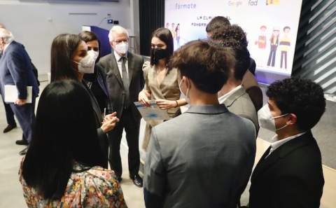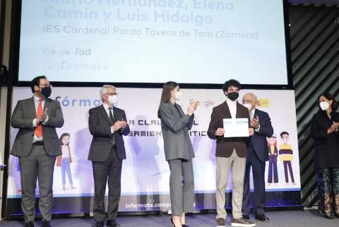 Tres alumnos de 1.º de Bachillerato del IES Cardenal Pardo de Tavera, Elena Camín, Mario Hernández y Luis Hidalgo, asistieron, acompañados de su profesora Teresa Vaquero, al acto de entrega de premios del programa (In)fórmate, organizado por la FAD y presidido por SM la Reina Doña Letizia, que se celebró en el Campus Google de Madrid.