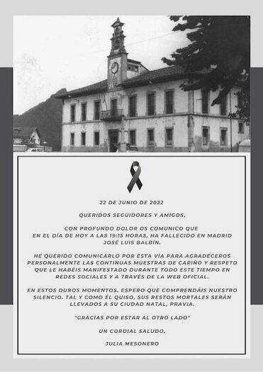 El periodista asturiano José Luis Balbín ha fallecido hoy, a los 81 años, en Madrid, según ha informado su esposa, a través de un comunicado en Twitter, en el que ha agradecido las muestras de cariño y respeto mostradas “durante todo este tiempo”, a la vez que ha informado sobre el traslado de los restos mortales del comunicador a su ciudad natal, Pravia.