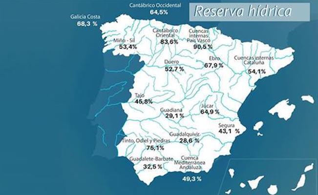 Los embalses almacenan actualmente 25.968 hectómetros cúbicos (hm³) de agua, disminuyendo en la última semana en 469 hectómetros cúbicos (el 0,8 por ciento de la capacidad total actual de los embalses).