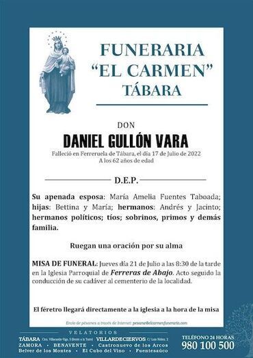 La misa funeral por el bombero Daniel Gullón Vara se realizará hoy por la tarde, a las 20:30 h., en la iglesia parroquial de Ferreras de Abajo. Acto seguido, la conducción de su cadáver al cementerio de la localidad.