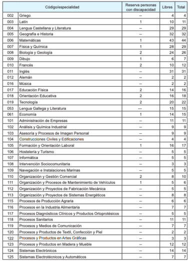 La Xunta de Galicia ha publicado la convocatoria del conocido como Concurso de Estabilización para maestros y profesores. Así, mediante concurso de méritos, se pretende cubrir 595 plazas en el cuerpo de profesores de enseñanza secundaria, 44 en el cuerpo de profesores especialistas en sectores singulares de formación profesional, 63 plazas en el cuerpo de profesores de escuelas oficiales de idiomas, 9 plazas en el cuerpo de catedráticos de música y artes escénicas, 78 plazas en el cuerpo de profesores de música y artes escénicas, 26 plazas en el cuerpo de profesores de artes plásticas y diseño, 8 plazas en el cuerpo de maestros de taller de artes plásticas y diseño y 333 plazas en el cuerpo de maestros, situadas en el ámbito de gestión de la Consellería de Cultura, Educación, Formación Profesional y Universidades.