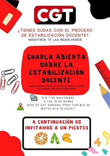 CGT organiza una charla sobre el proceso de estabilización docente que tendrá lugar en su sede, a las 18:00 horas, de este lunes, 7 de noviembre.