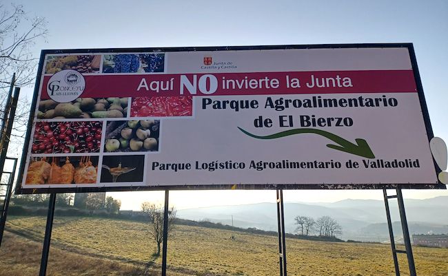 La valla centra su foco en el Parque Agroalimentario de el Bierzo, que fue prometido y anunciado en el marco incomparable del Palacio de Canedo, por el propio presidente de la Junta para mejorar las sinergias entre producción y demanda, ante la presencia de distintas administraciones y empresarios. Finalmente todo ese bombo quedó en nada porque el parque se ha ido directamente a Valladolid en una mezcla entre insulto y desprecio hacia El Bierzo.