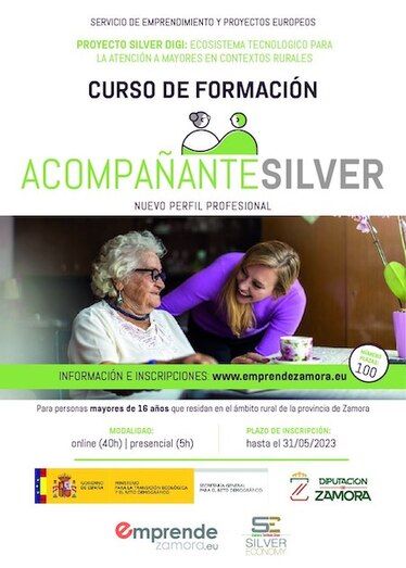 La Diputación de Zamora, a través del aÁrea de Emprendimiento y Fondos Europeos, pone en marcha un nuevo curso "Acompañante Silver en el Medio Rural". Las inscripciones se pueden realizar antes del 31 de mayo en este enlace: https://www.emprendezamora.eu/cursos/detalles/curso-basico-de-acompanante-silver/26.