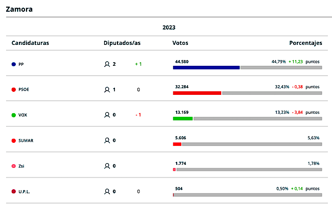 En las elecciones generales del 23J, el Partido Popular gana en Zamora, con dos diputados y un 44,67 % de los votos (+11,11 puntos), obtenido una victoria importante en la provincia, con 10.000 votos más que en las anteriores generales. Elvira Velasco repetiría por el PP y Óscar Ramajo sería la nueva cara popular en el Congreso.