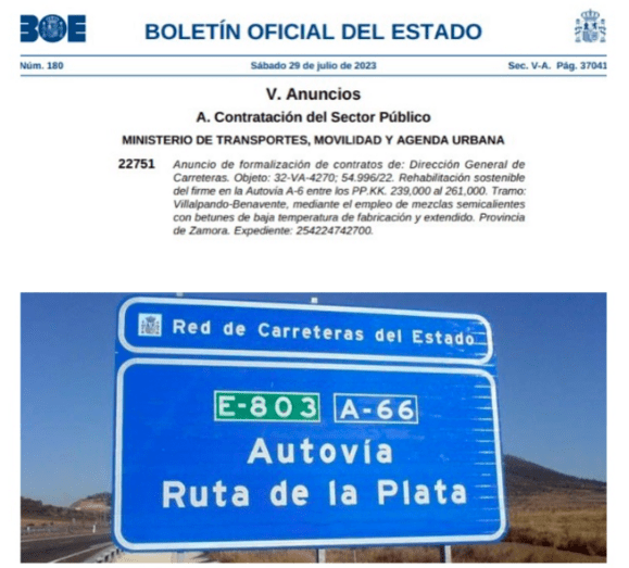 Hoy se ha publicado en el BOE la Resolución del Ministerio de Transportes, Movilidad y Agenda Urbana por la que que se anuncia la rehabilitación sostenible del firme en la A-6 entre los PP.KK. 239,000 al 261,000, tramo que comprendería los puntos entre Villalpando y Benavente.
