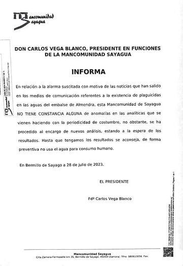 Carlos Vega Blanco, presidente de Sayagua y alcalde de Fresno de Sayago, ha aconsejado que no se consuma el agua de Sayago, a pesar de que insiste en que el agua era apta para el consumo, según los análisis realizados el pasado 12 de julio.