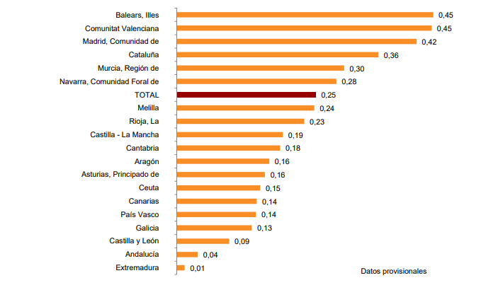 Durante el tercer trimestre de 2023 se estima que la población creció en todas las comunidades autónomas, así como en las ciudades autónomas de Ceuta y Melilla. Los mayores incrementos en términos relativos se dieron en Illes Balears (0,45 %), Comunitat Valenciana (0,45 %) y Comunidad de Madrid (0,42 %) y, entre los menores, Extremadura, Andalucía y Castilla y León, que solo subió en un 0,09 %.