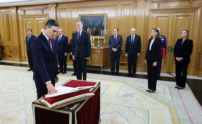 Ante un ejemplar de la Carta Magna, Pedro Sánchez ha prometido cumplir fielmente con las obligaciones del cargo con lealtad al rey, guardar y hacer guardar la Constitución como norma fundamental del Estado y mantener en secreto las deliberaciones del Consejo de Ministros.