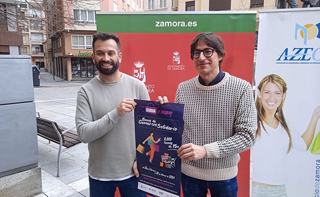 Esta mañana, el teniente de alcalde y concejal de Ayuntamiento de Zamora, David Gago, junto al presidente de AZECO, Ruperto Prieto, han presentado la nueva campaña de bonos solidarios "Suma y sigue", en la que el Ayuntamiento, en colaboración con AZECO, aportará 130.000 euros para 8.000 bonos de 15 euros cada bono, para las personas que estén en situación de desempleo y lo soliciten en el debido plazo para poder gastar en los comercios locales adheridos a la campaña.
