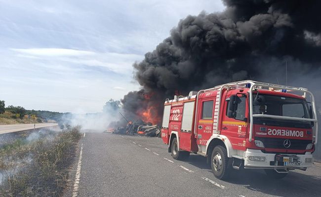 En la tarde de ayer, dos vehículos equipados con bombas urbanas pesadas del Parque Tierras de Aliste, perteneciente al Consorcio Provincial de Bomberos de la Diputación de Zamora y con base en San Vitero, intervinieron en un incendio que afectó a un camión en el kilómetro 500 de la carretera N-122. El siniestro tuvo lugar en el término municipal de Fonfría, coincidiendo con el área de descanso ubicada en el cruce de acceso a Castro de Alcañices, en dirección hacia Portugal.