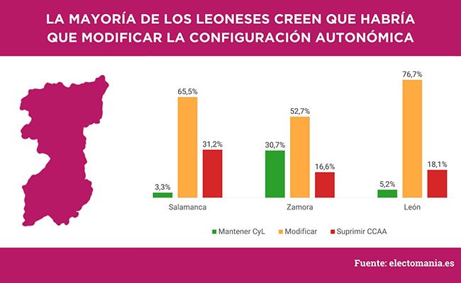 En todo caso, los datos de esta encuesta de Electomania muestran el escaso arraigo a la comunidad de Castilla y León existente en las tres provincias de la Región Leonesa (León, Zamora y Salamanca), donde es mayoritaria la opción de modificar el mapa autonómico, corriente que se hace especialmente patente en la provincia de León. Resultados que irían en sintonía con la petición que aprobó recientemente la Diputación de León de formar una comunidad autónoma de la Región Leonesa formada por estas tres provincias, que también han solicitado ya 64 ayuntamientos de León, Zamora y Salamanca.