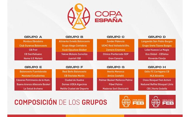 ¡La I Copa España ya está en marcha! La cita, que contará con un total de 40 equipos de las Ligas Primera FEB, Segunda FEB y Tercera FEB, iniciará su camino con una primera Fase compuesta por ocho grupos de cinco equipos que se han configurado en el día de hoy tras el fin del plazo de inscripciones. Para ello, se han atendido criterios de distribución geográfica, deportiva y compensación entre categorías.