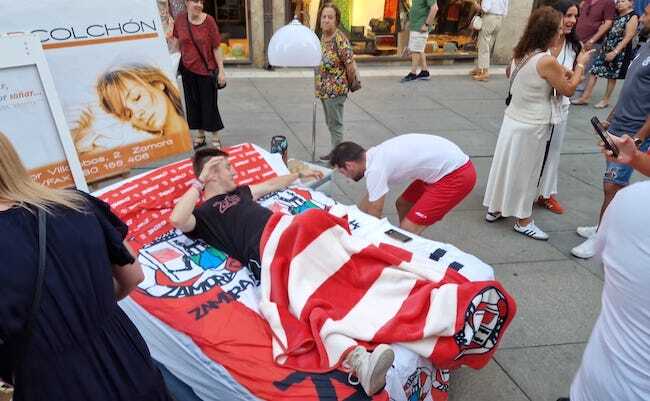 Dos jugadores del Zamora CF fueron los encargados de interrumpir sus dulces sueños en la cama "del Zamora", Castañeda y Pito Camacho, que fueron toda una sorpresa para los viandantes y niños que estaban observando la escena y pudieron disfrutar charlando con ellos y compartiendo sus impresiones sobre lo que significó el ascenso a 1.ª RFEF, un auténtico sueño cumplido.