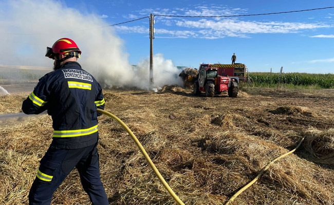 Dos autobombas y dos dotaciones de bomberos del Parque Zona Centro con base en el Parque de Maquinaria en la capital zamorana del Consorcio de Prevención y Extinción de Incendios, Salvamentos y Protección Civil de la Diputación de Zamora han intervenido en las labores de extinción del incendio pacas de paja apiladas en una tierra en Torres del Carrizal, tras recibir a las 08:53 horas la alerta del Centro