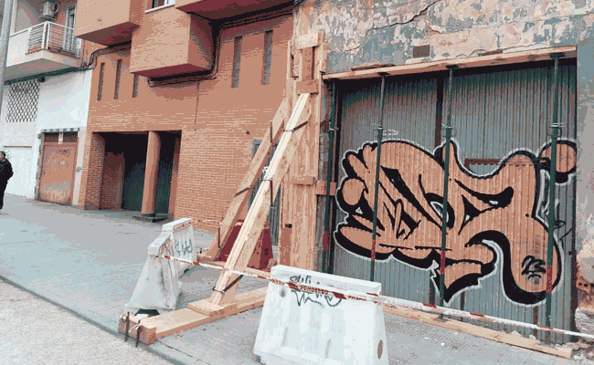 En esa ubicación existe una antigua nave abandonada que sobresale de la línea del resto de edificaciones y parece que está en una situación de ruina inminente. Esta es la razón, seguramente, por la que el Ayuntamiento ha apuntalado esa zona ocupando la sujeción una zona de la acera y parte de la calzada, obligando a los vecinos a dejar la acera y caminar por el asfalto con peligro al bajar y subir para las personas con movilidad reducida que abundan en esta calle llena de comercios.