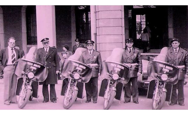 En esta foto de hace cincuenta años don Fernando Chacòn hace entrega de cuatro nuevas motocicletas para el servicio de la Policía Municipal.