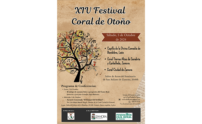 Sábado 5 de Octubre. En el salón de actos del Seminario Menor de San Atilano, de Zamora, a las 20:00h: Festival Coral con la participación de la Coral Tierras Altas de Sanabria y Carballeda, la Capilla de la Divina Comedia de Bembibre, León y la Coral Ciudad de Zamora.