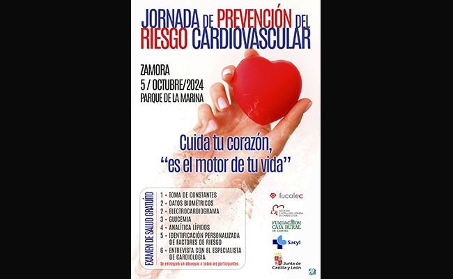 La Junta de Castilla y León, a través del Servicio de Cardiología del Complejo Asistencial de Zamora, organizará este sábado, 5 de octubre, una Jornada de Prevención del Riesgo Cardiovascular, que contará con la colaboración de la Sociedad Castellano-Leonesa de Cardiología, la Fundación Castellano-Leonesa de Cardiología y la Fundación Caja Rural de Zamora. El lugar elegido para esta iniciativa es el parque de La Marina, donde los asistentes podrán recibir información sobre patologías cardiovasculares y realizarse exámenes de salud gratuitos tanto en horario matutino (10:00 a 14:00 horas) como vespertino (16:30 a 20:00 horas) con la participación de todos los integrantes del servicio de cardiología del hospital Virgen de la Concha.