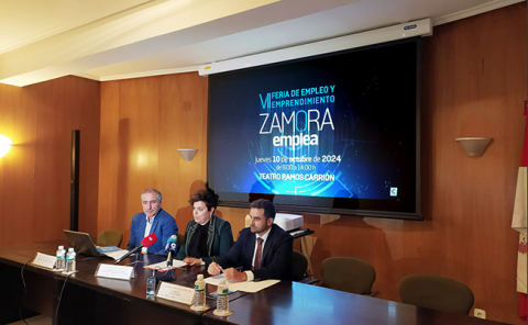 Presentamos la 7ª Feria de Empleo y Emprendimiento #ZamoraEmplea que se celebrará el jueves 10 de octubre de 2024, de 09:00 a 14:00 en el Teatro Ramos Carrión de Zamora. Durante la presentación, que ha tenido lugar en el Salón de Actos de la Cámara, han participado la vicepresidenta de la Cámara de Comercio, Beatriz Lozano López; el Gerente del ECYL de Zamora, Efrén Fernández Miguel, y Carlos Prieto Sánchez, Técnico de la Cámara y Coordinador de la feria.