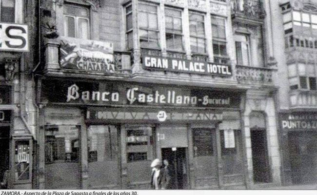 En esta foto que me envíò mi amigo Juanmi Colino del que fue Hotel Palas en la Plaza Sagasta, no solamente es testimonio de la existencia de aquel establecimiento hotelero, sino que puede observarse en un balcón una pancarta que dice : “Entrega tu chatarra” y en la planta baja del edificio estuvo el Banco Castellano , con un rótulo que dice “Viva España” lo que indica que esta fotografía fue tomada en plena Guerra Civil.