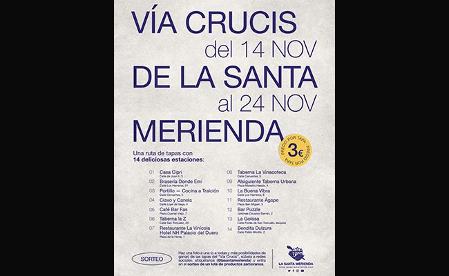 Además, la asociación pondrá en marcha durante los días del “vía crucis” un sorteo a través de las redes sociales que consistirá en subir una foto de la tapa del establecimiento etiquetando a @lasantamerienda. Todos los participantes entrarán en el sorteo de un lote de productos Zamoranos (cuantas más fotos, más posibilidades de ganar).