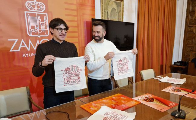 El concejal de Promoción Económica y Protección Ciudadana, David Gago, y el presidente de AZECO, Ruperto Prieto, han presentado esta campaña que llevará un total de 14.000 bolsas diseñadas por el equipo de Alto el Fuego a los diferentes comercios de Zamora para que se repartan entre todos los clientes.