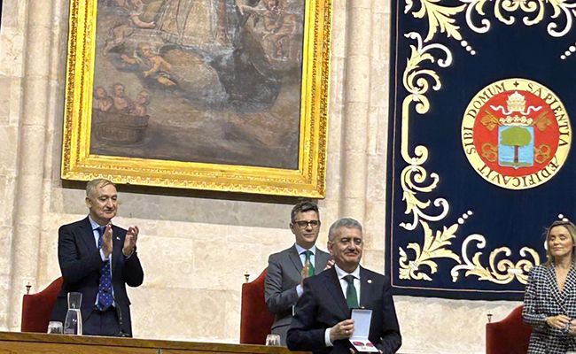 Isaac Macías Fontanillo, presidente del Colegio Oficial de Graduados Sociales de Zamora recibe, de manos del ministro de Justicia, Presidencia y Relaciones con las Cortes, Félix Bolaños, la Cruz distinguida de San Raimundo de Peñafort en el Paraninfo de la Dacultad de Derecho de la Universidad de Valladolid este viernes 17 de enero. Esta distinción que le ingresa como miembro de la esta Orden Jurídica creada por el ministerio de Justicia en 1944 le hace acreedor al reconocimiento de jurista de reconocido prestigio a la que pertenecen, desde esa fecha, unos trece mil profesionales del Derecho en base a sus méritos en el mundo de la Justicia y que son otorgados, por concurso de méritos, por la propia secretaría de estado de honores y recompensas del propio ministerio.