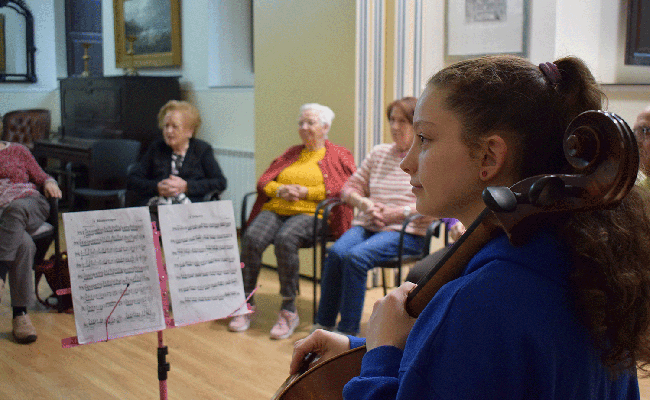 Amara, una chelista de 12 años, lleva la música a personas con demencia