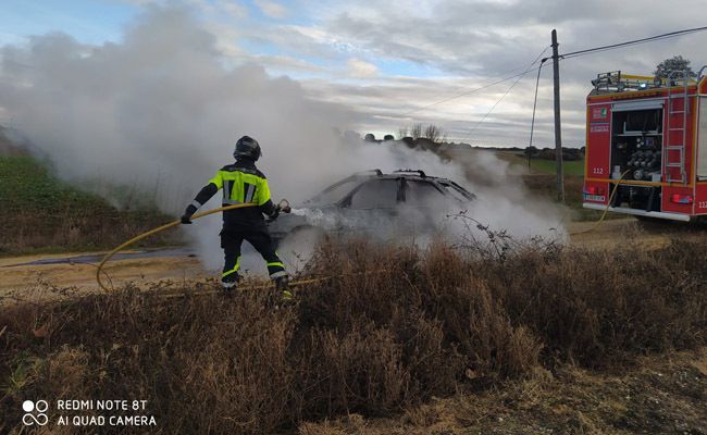 Bomberos de la Diputación apagan un vehículo incendiado en un camino entre Cabañas de Sayago y Villanueva de Campeán
