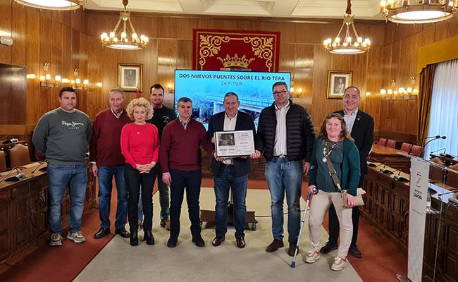 El presidente de la Diputación de Zamora, Javier Faúndez Domínguez, el vicepresidente cuarto y diputado por la comarca de Benavente, Emilio Fernández Martínez, y la diputada de Carreteras, Atilana Martínez Mayado, han presentado hoy el proyecto para la construcción de los dos puentes que se construirán sobre el río Tera en la carretera ZA-P-1508, que comunica Santa Marta de Tera con Santa Croya de Tera, que contará con un presupuesto de licitación de 2.193.000 euros, en una presentación en la que también han estado presentes el alcalde de Camarzana de Tera, Jaime Panizo Rodríguez, y el de Santa Croya de Tera, Oscar García Fernández, junto a concejales de la corporación municipal.